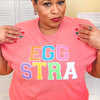 - This soft chenille letter patch t-shirt's design features the text, "EGG STRA," stacked in two lines, in a mix of letter patch colors. This top is perfect for springtime and Easter season!